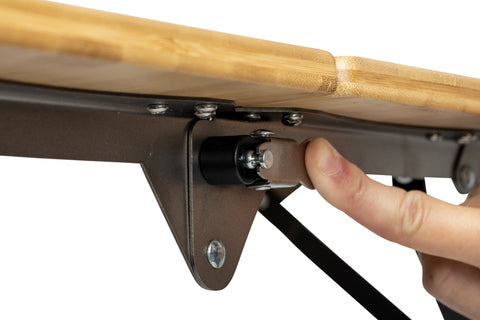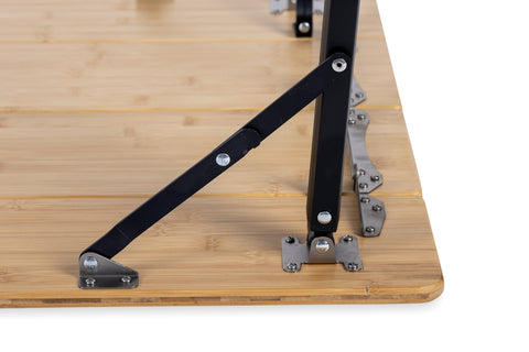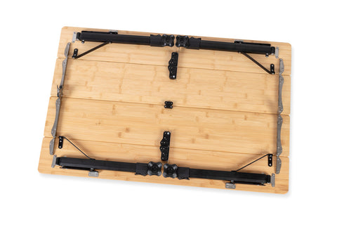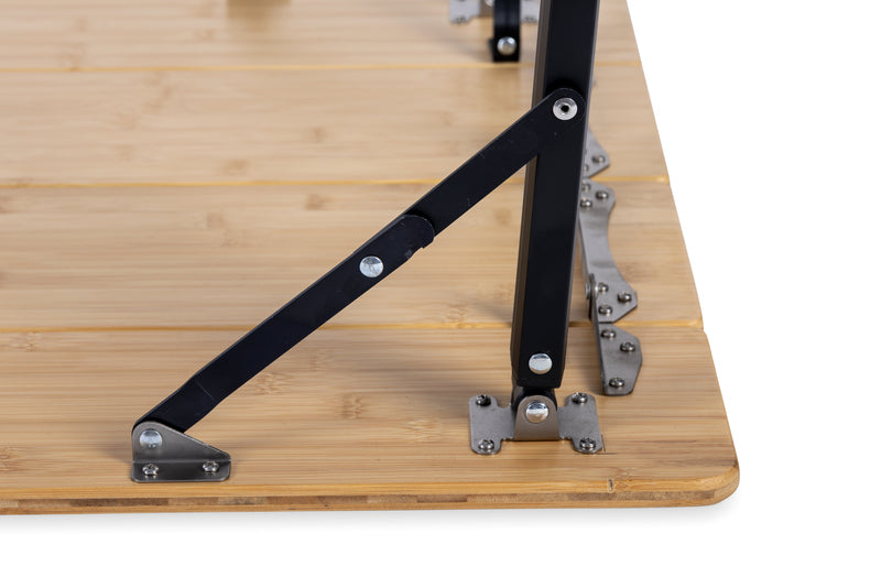 Optimiertes schwarz-lackiertes Gestell mit Skalenmarkierung und Tellerfüßen für mehr Standfestigkeit. Tischplatte aus 4 Panelen für kleines Packmaß. Perfekt für Campingbusse und Minicamper mit wenig Stauraum. Max. Traglast: 30 kg, Material: Tischplatte: Bambus, Gestell: Aluminium Höhe:43cm